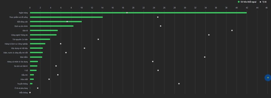 Hiện nay, khối ngoại vẫn đang ôm nhiều nhất nhóm Ngân hàng, Thực phẩm và đồ uống, Bất động sản, Dịch vụ tài chính, Bán lẻ, Công nghệ. Trong đó, khối ngoại nắm chủ đạp phần lớn vẫn là nhóm Ngân hàng.