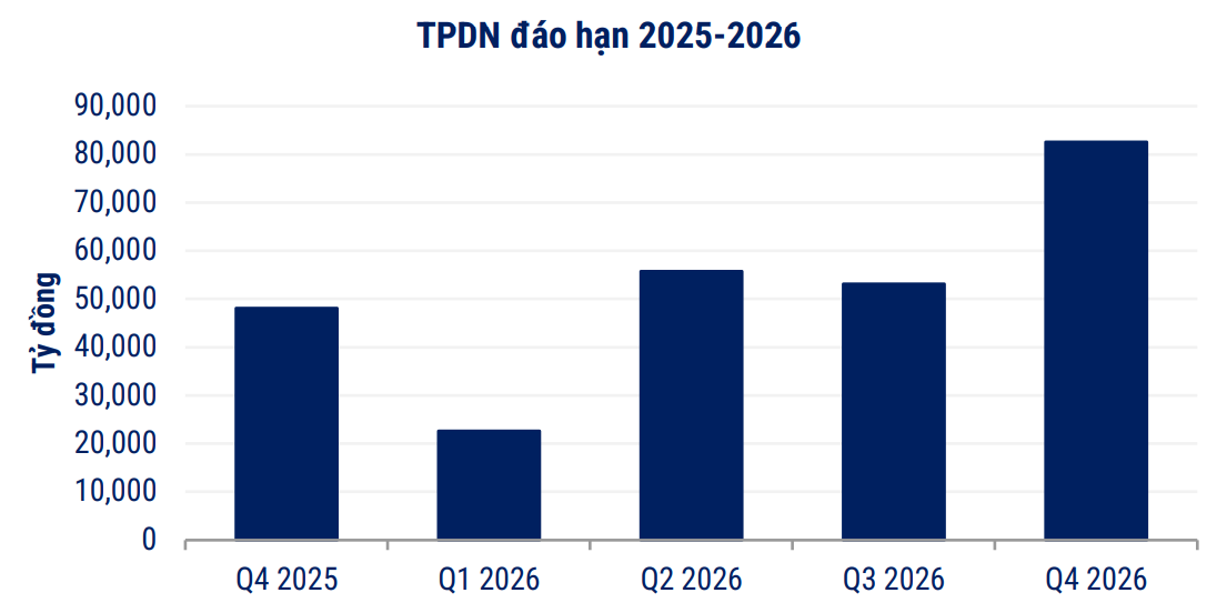 Giá trị trái phiếu sẽ đáo hạn trong 3 tháng cuối năm 2025 ước tính 48.080 tỷ đồng. Trong số này, trái phiếu bất động sản chiếm 38% (18.331 tỷ đồng) và trái phiếu ngân hàng chiếm 29% (13.781 tỷ đồng).