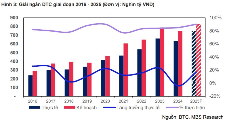 Báo cáo mới đây của Chứng khoán MB (MBS) chỉ rõ, giải ngân đầu tư công sẽ tăng mạnh trong năm 2025.