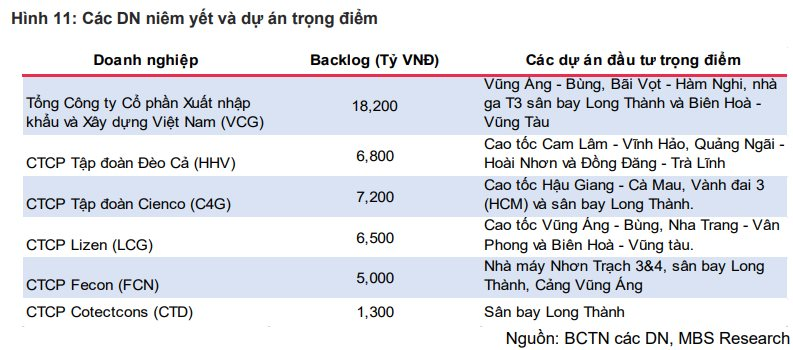 Đối với các doanh nghiệp xây dựng niêm yết, nhóm phân tích đánh giá cao các doanh nghiệp có kinh nghiệm triển khai và backlog xây dựng lớn nhằm hưởng lợi tại các dự án trọng điểm, bên cạnh đó, kinh nghiệm triển khai có thể tác động tích cực trong quá trình đấu thầu để tăng trưởng backlog.