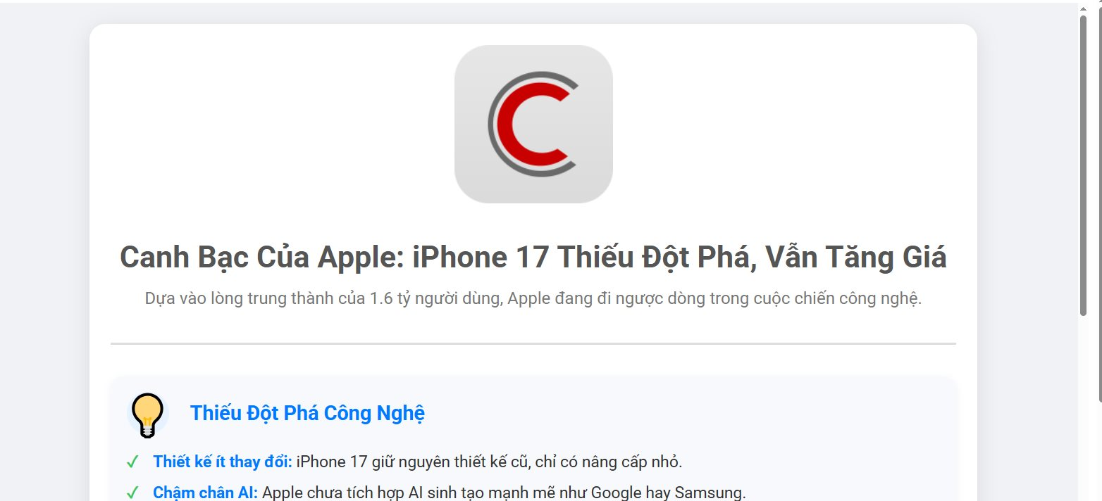 Tõm lại, Apple từng được ca ngợi vì "nghệ thuật tạo ra nhu cầu" với những sản phẩm thay đổi cả thị trường. Thế nhưng, ở iPhone 17, dấu ấn lớn nhất lại nằm ở chiến lược tài chính nhiều hơn là công nghệ. Đặt cược vào sự trung thành và mức giá cao giúp duy trì lợi nhuận, nhưng đồng thời đặt ra câu hỏi: liệu Apple có đang hy sinh tốc độ đổi mới để đổi lấy sự an toàn?