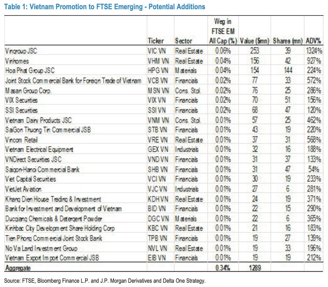 Theo ước tính của J.P. Morgan, các quỹ chỉ số toàn cầu có thể rót khoảng 1,3 tỷ USD vào thị trường chứng khoán Việt Nam, tương đương tỷ trọng 0,34% trong rổ FTSE Emerging Market All Cap Index. Dựa trên quy mô vốn hóa hiện tại, khoảng 22 cổ phiếu Việt Nam có thể được thêm vào danh mục chỉ số này.