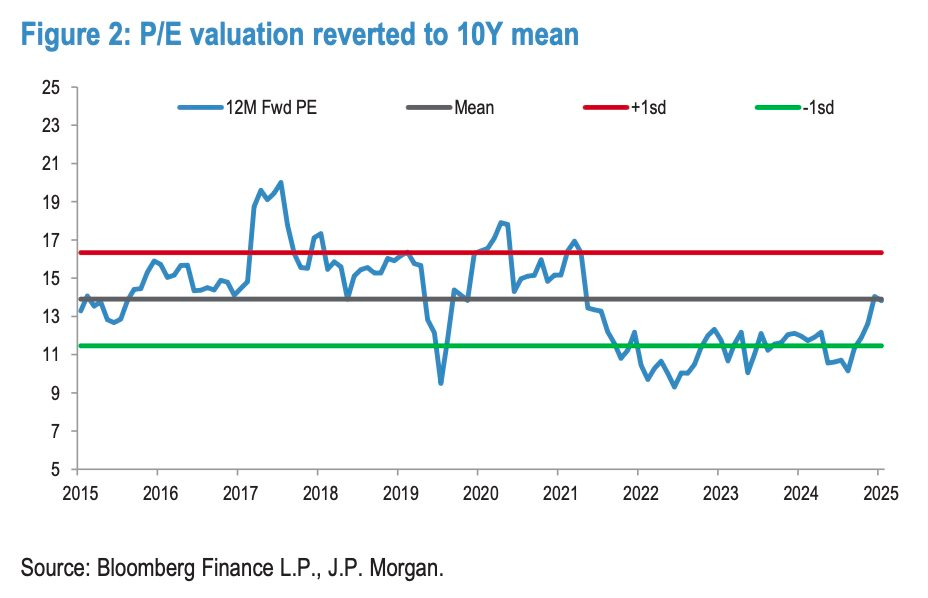 J.P. Morgan cho rằng mức định giá hiện tại của VN-Index vẫn ở vùng hợp lý. Chỉ số được dự báo giao dịch với P/E dự phóng 15 – 16,5 lần trong 12 tháng tới, cao hơn trung bình ASEAN nhưng vẫn thấp hơn hai giai đoạn đỉnh lịch sử năm 2018 và 2021. Điều này phản ánh kỳ vọng tăng trưởng dài hạn của nền kinh tế và năng lực sinh lời ngày càng cải thiện của doanh nghiệp Việt Nam.
