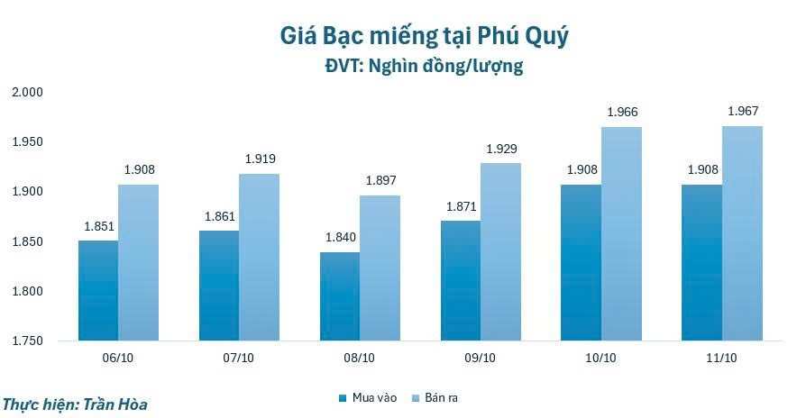 Giá bạc tuần này vẫn giữ nhịp tăng trong tuần ở cả chiều mua và chiều bán. Tại Phú Quý, giá bạc đóng cửa phiên tuần ở mốc 1.908.000 – 1.967.000 đồng/lượng, tăng 74.000 đồng/lượng ở chiều mua và 73.000 đồng/lượng ở chiều bán so với mức đóng cửa tuần trước. Giá bạc thỏi 1kg vượt mốc 50 triệu đồng, chốt phiên cuối tuần ở mốc 50,853 – 52,426 triệu đồng (mua – bán).