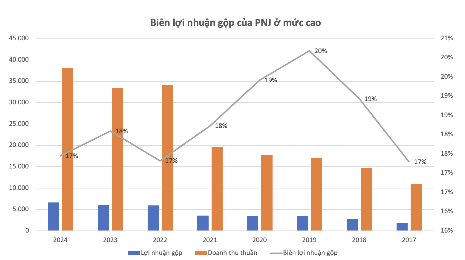 Biên lợi nhuận gộp của doanh nghiệp này thường duy trì ở mức từ 17%-20%, trong khi biên lợi nhuận gộp của các doanh nghiệp tập trung vào mảng vàng miếng, nhẫn thường chỉ ở mức 1 chữ số.