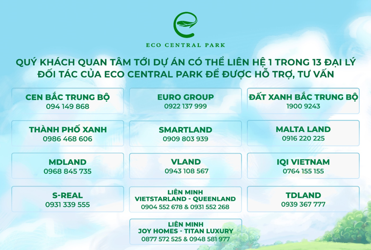 Khách hàng quan tâm dự án và sự kiện có thể liên hệ một trong các đại lý chính thức của Eco Central Park để được tư vấn, hỗ trợ.