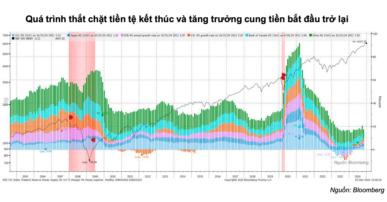 Trong báo cáo mới đây, Chứng khoán Agriseco nhận định trong bối cảnh lạm phát tiếp tục xu hướng giảm và tiệm cận mục tiêu của các NHTW, thị trường lao động toàn cầu cân bằng trở lại. Qua đó, tạo điều kiện để các NHTW tiếp tục lộ trình hạ lãi suất. Hiện tại có khoảng 70% NHTW trên thế giới đã ra quyết định hạ lãi suất và tăng trưởng cung tiền M2 bắt đầu phục hồi trở lại sau giai đoạn thắt chặt 2022-2023.