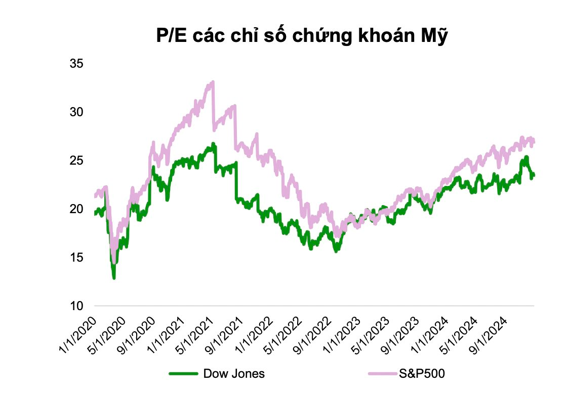 Trong năm 2024, dòng vốn đầu tư toàn cầu có xu hướng đổ về Mỹ một cách rõ nét. Các chỉ số chứng khoán Mỹ như Dowjones, S&P500 đều tăng mạnh và lập đỉnh mới trong năm 2024 với động lực từ nhóm công nghệ. Định giá của các chỉ số chứng khoán Mỹ cũng liên tục tăng cao và hiện đang ở quanh vùng cao nhất lịch sử.