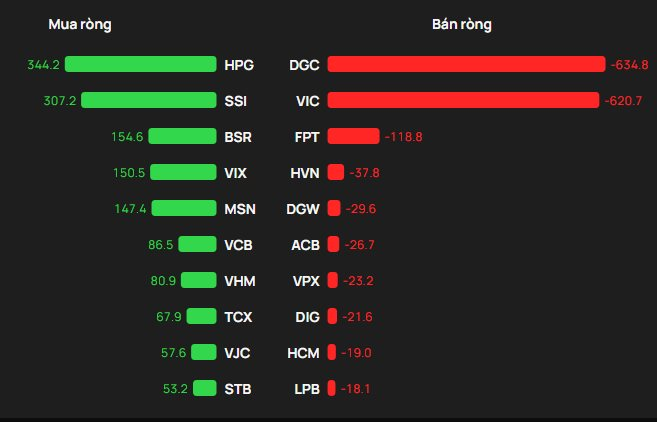 Ngược lại, DGC là cổ phiếu khối ngoại bán mạnh nhất với 634 tỷ đồng. Theo sau, các cổ phiếu VIC và FPT cũng bị "xả" 620 tỷ đồng và 119 tỷ đồng.