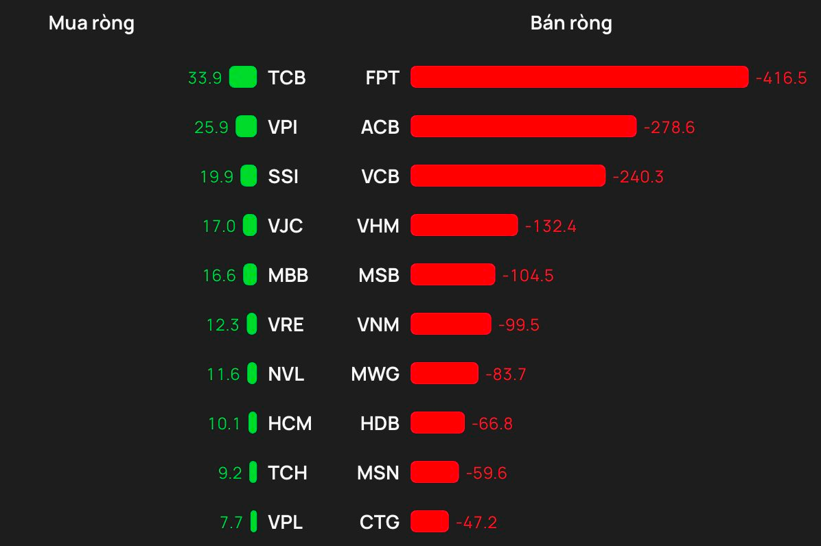 Chiều ngược lại, áp lực bán ròng tập trung mạnh nhất tại FPT với giá trị khoảng 417 tỷ đồng. Theo sau là ACB khoảng 279 tỷ đồng, VCB khoảng 240 tỷ đồng, VHM khoảng 132 tỷ đồng và MSB khoảng 105 tỷ đồng.