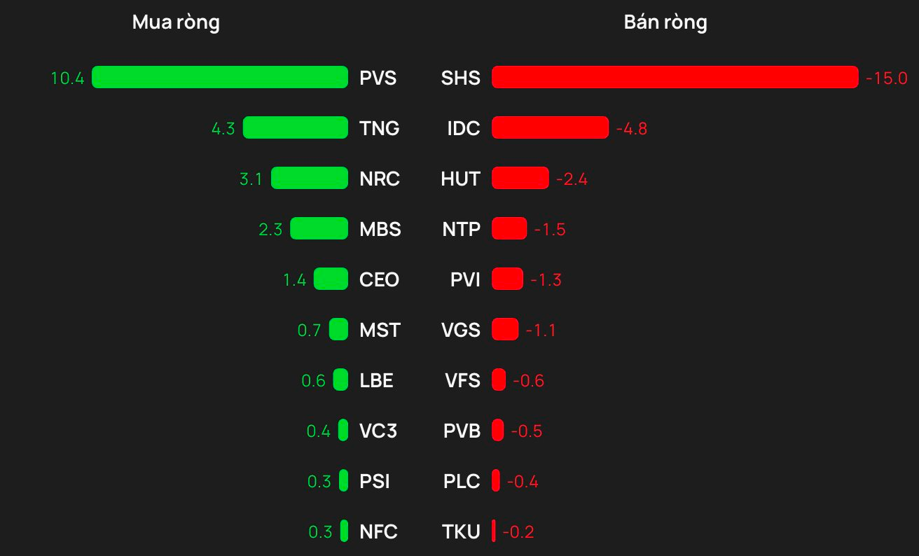 Ở chiều bán, SHS bị bán ròng mạnh nhất với khoảng 15 tỷ đồng, tiếp đến là IDC khoảng 5 tỷ đồng, HUT khoảng 2 tỷ đồng, NTP khoảng 2 tỷ đồng và PVI khoảng 1 tỷ đồng.