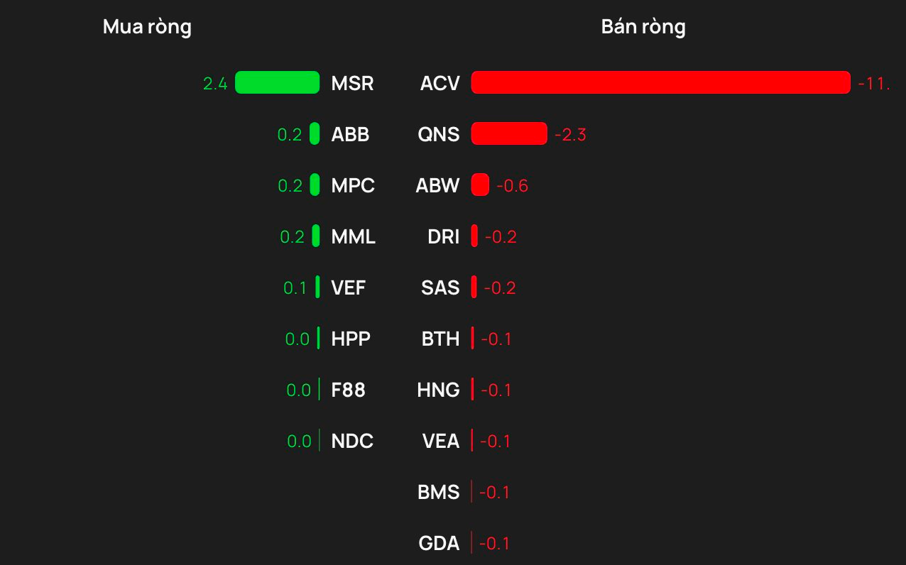 Ở chiều ngược lại, ACV dẫn đầu danh sách bị bán ròng với khoảng 11 tỷ đồng, theo sau là QNS khoảng 2 tỷ đồng, ABW khoảng 0,6 tỷ đồng, DRI khoảng 0,2 tỷ đồng và SAS khoảng 0,2 tỷ đồng.