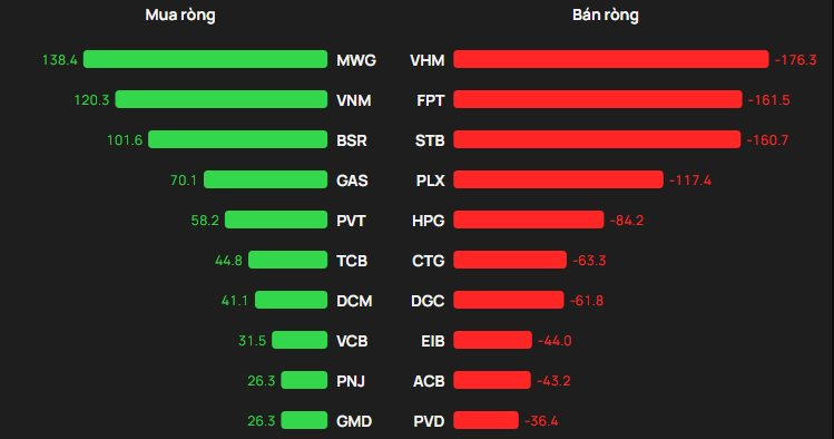Ở chiều ngược lại, áp lực bán ròng tập trung mạnh nhất tại VHM với giá trị khoảng 176 tỷ đồng. Xếp tiếp theo là FPT (162 tỷ đồng), STB (161 tỷ đồng), PLX (117 tỷ đồng) và HPG (84 tỷ đồng).