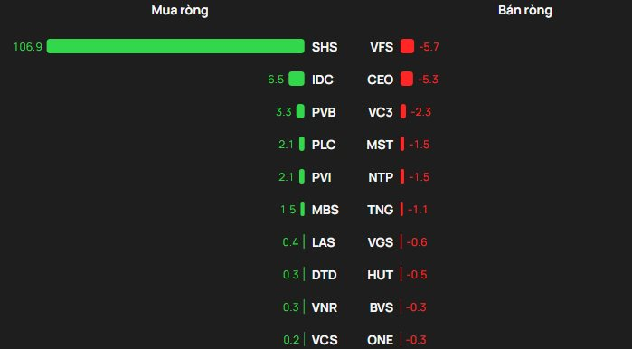 Trong khi đó, ở chiều bán, khối ngoại bán ròng mạnh nhất tại VFS với khoảng 6 tỷ đồng, theo sau là CEO (5 tỷ đồng), VC3 (2 tỷ đồng), MST (2 tỷ đồng) và NTP (2 tỷ đồng).