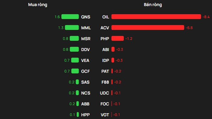 Tại chiều mua, khối ngoại mua ròng lớn nhất tại QNS với giá trị khoảng 2 tỷ đồng. Các mã đứng sau gồm MML (1 tỷ đồng), MSR và DDV (cùng bị bán ròng 0,8 tỷ đồng), VEA và GCF (cùng bị bán ròng 0,7 tỷ đồng).