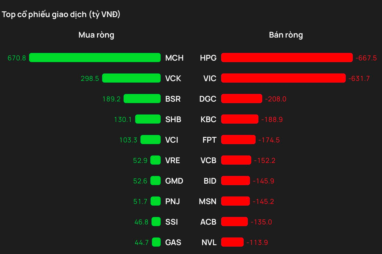 Tại chiều mua, cổ phiếu MCH được khối ngoại mua mạnh nhất trên HOSE với giá trị hơn 670 tỷ đồng. Theo sau, VCK và BSR là mã tiếp theo được gom mạnh 299 tỷ đồng và 189 tỷ đồng.