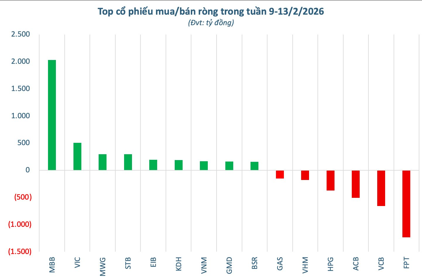 Ở chiều ngược lại, áp lực bán ròng tập trung tại một số bluechip. FPT bị bán mạnh nhất với 1.236 tỷ đồng, tiếp đến là VCB (-659 tỷ đồng) và ACB (-509 tỷ đồng). Các mã như HPG (-373 tỷ đồng), VHM (-177 tỷ đồng) và GAS (-150 tỷ đồng) cũng ghi nhận giá trị bán ròng đáng kể.