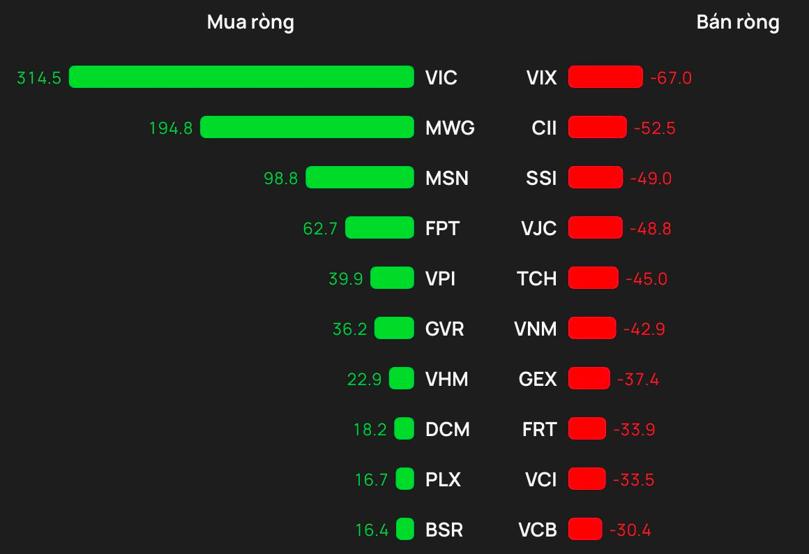 Ở chiều ngược lại, áp lực bán ròng tập trung mạnh nhất tại VIX với giá trị khoảng 67 tỷ đồng. Theo sau là CII với gần 53 tỷ đồng, SSI với khoảng 49 tỷ đồng, VJC với gần 49 tỷ đồng và TCH với khoảng 45 tỷ đồng.