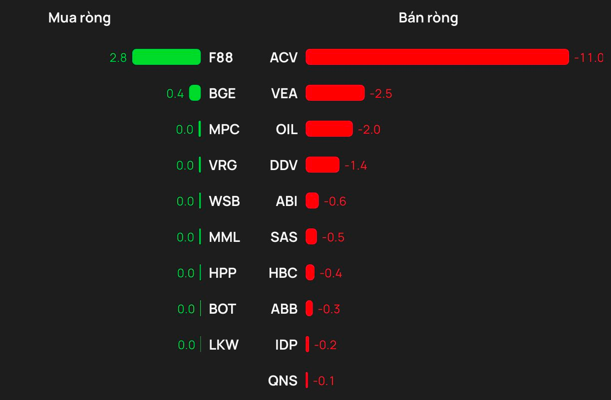 Ở chiều ngược lại, ACV bị bán ròng mạnh nhất với khoảng 11 tỷ đồng, tiếp đến là VEA với gần 3 tỷ đồng, OIL với khoảng 2 tỷ đồng, DDV với khoảng 1 tỷ đồng và ABI với khoảng 0,6 tỷ đồng.