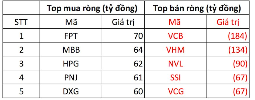 Ngược chiều, cổ phiếu FPT được mua ròng mạnh nhất toàn thị trường với giá trị 70 tỷ đồng. Xếp tiếp theo, cổ phiếu MBB, HPG, PNJ và DXG đồng loạt được mua ròng khoảng 60-64 tỷ đồng mỗi mã.