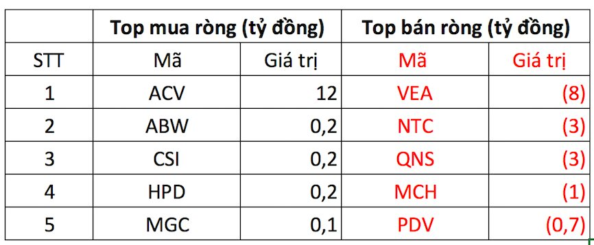 Chiều mua, cổ phiếu ACV được mua ròng với giá trị khoảng 12 tỷ đồng; theo sau, ABW, CSI và HPD cũng được mua ròng song giá trị không nhiều.