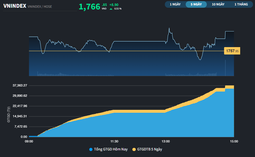 VN-Index chốt phiên tăng 8,9 điểm lên 1.766,85 điểm (+0,51%). Tổng khối lượng giao dịch sàn đạt 39.894 tỷ đồng, tương đương 1.170 tỷ đồng.