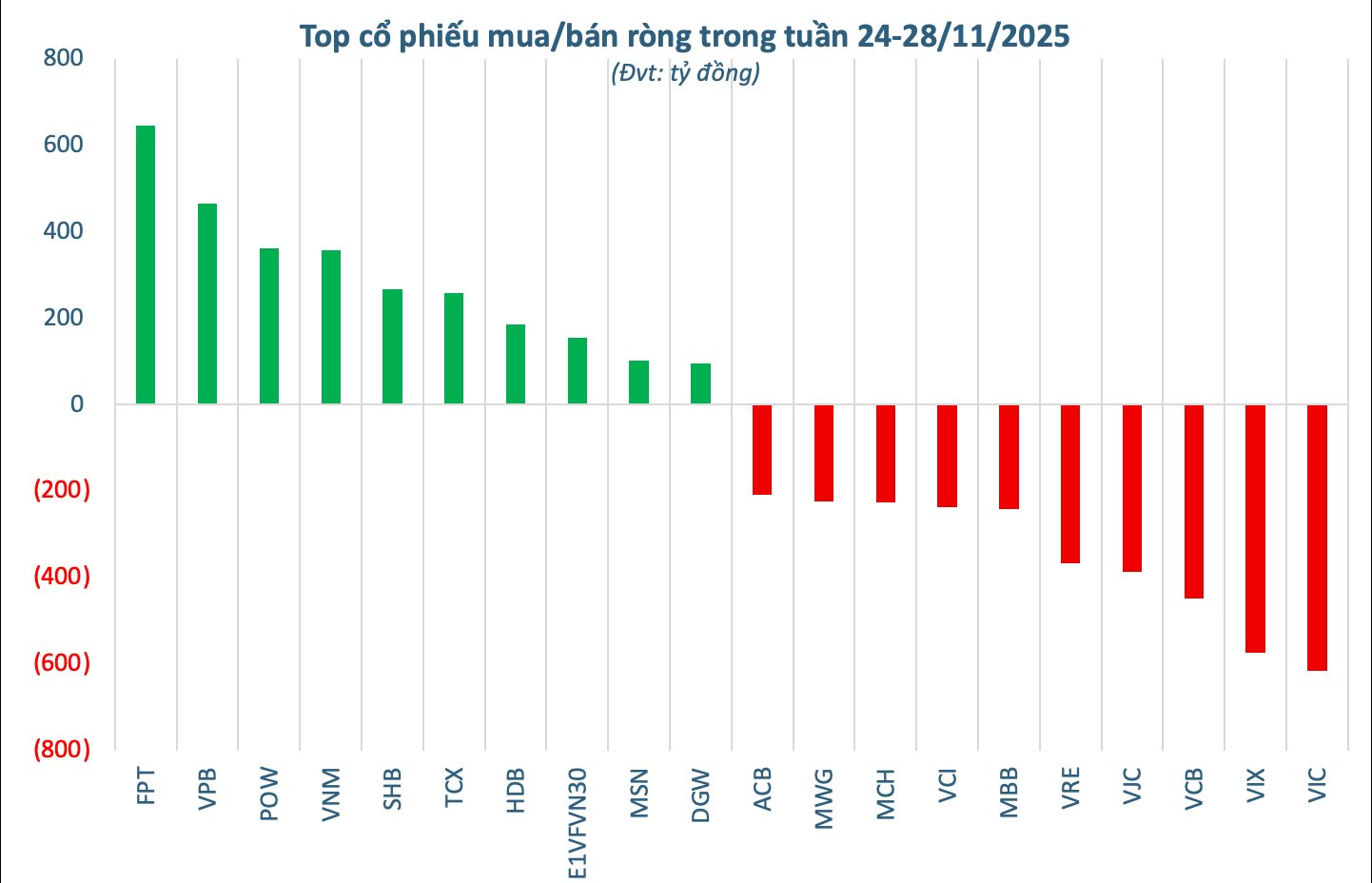 Thống kê theo từng mã chứng khoán cho thấy, trong tuần giao dịch vừa qua, VIC là tâm điểm bị bán ròng mạnh nhất với giá trị 616 tỷ đồng. Theo sau là VIX với 574 tỷ đồng, kế đến là VCB (448 tỷ đồng) và VJC (386 tỷ đồng). Nhiều cổ phiếu vốn hóa lớn khác cũng chịu áp lực rút vốn như VRE (367 tỷ đồng), MBB (242 tỷ đồng), VCI (237 tỷ đồng), MCH (227 tỷ đồng), MWG (224 tỷ đồng) và ACB (208 tỷ đồng).