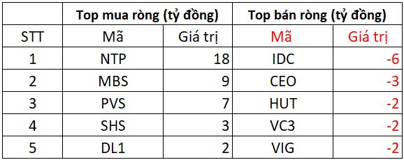 Tại chiều mua, NTP được mua ròng nhiều nhất khoảng 18 tỷ đồng; MBS, PVS cũng được mua ròng 7-9 tỷ đồng; theo sau, SHS, DL1 được mua ròng với giá trị 2-3 tỷ đồng mỗi cổ phiếu.