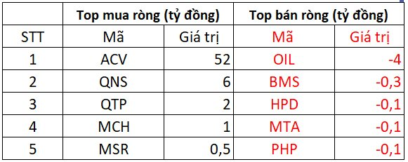 Chiều mua, cổ phiếu ACV được mua ròng mạnh nhất 52 tỷ đồng; theo sau, QNS, QTP và MCH được mua ròng với giá trị khoảng một vài tỷ đồng; MSR cũng được mua ròng không đáng kể.