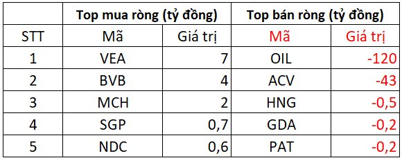 Ngược chiều, cổ phiếu OIL bị bán ròng với giá trị đột biến 120 tỷ, ACV bị "xả" 43 tỷ đồng trong khi HNG, GDA và PAT bị bán ròng với giá trị không nhiều, chỉ khoảng vài trăm triệu.