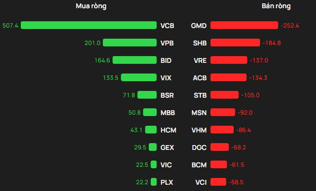 Ở chiều ngược lại, dòng tiền ngoại ghi nhận lực “gom” áp đảo tại nhóm ngân hàng. VCB là cổ phiếu được mua ròng mạnh nhất với giá trị khoảng 507 tỷ đồng, bỏ xa phần còn lại. Các mã tiếp theo trong top 5 mua ròng lần lượt là VPB (201 tỷ đồng), BID (165 tỷ đồng), VIX (134 tỷ đồng) và BSR (72 tỷ đồng).