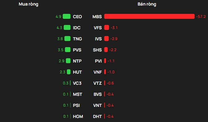 Ở chiều ngược lại, lực mua ròng ghi nhận khá phân hóa, trong đó CEO dẫn đầu danh sách mua ròng với khoảng 5 tỷ đồng. Xếp sau là IDC (4 tỷ đồng), TNG (4 tỷ đồng), PVS (4 tỷ đồng) và NTP (3 tỷ đồng).