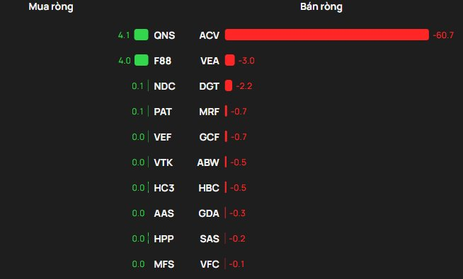 Ở chiều ngược lại, dòng tiền mua ròng trên UPCoM khá khiêm tốn. QNS và F88 cùng được mua ròng khoảng 4 tỷ đồng. Các mã NDC, PAT hay VEF cũng được mua ròng không đáng kể.