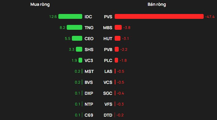 Ở chiều mua, khối ngoại mua ròng mạnh nhất tại IDC với giá trị khoảng 13 tỷ đồng. Xếp tiếp theo là TNG với 8 tỷ đồng và CEO với 6 tỷ đồng. Ngoài ra, SHS, VC3, MST, BVS,... cũng được mua ròng nhẹ vài trăm đến vài tỷ đồng.