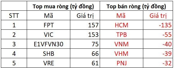 Chiều mua, cổ phiếu FPT được mua ròng mạnh nhất toàn thị trường với giá trị lên tới 157 tỷ đồng, VIC cũng được mua ròng mạnh tay 153 tỷ. Ngoài ra, CCQ E1VFVN30, SHB và VRE đồng loạt được mua ròng từ 61 tỷ tới 75 tỷ đồng.