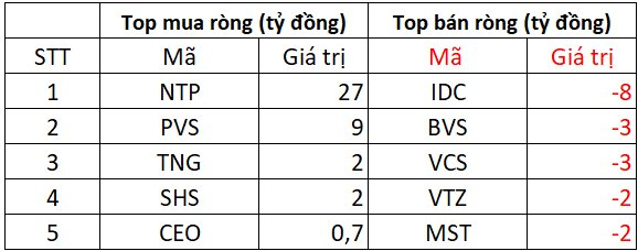 Tại chiều mua, NTP được mua ròng nhiều nhất khoảng 27 tỷ đồng; PVS cũng được mua ròng 9 tỷ đồng; theo sau, SHS, TNG được mua ròng với giá trị 2 tỷ đồng mỗi cổ phiếu.