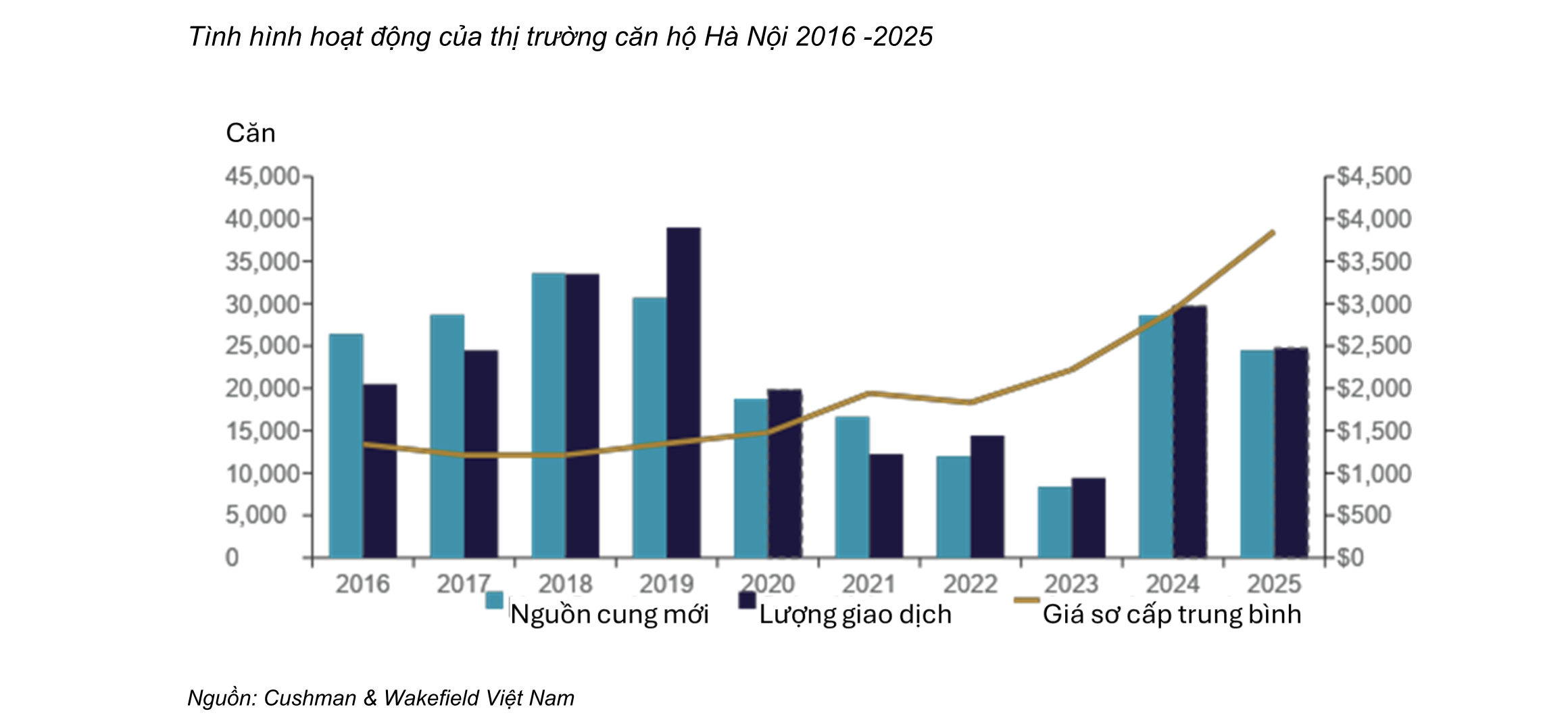 Trong 10 năm qua, thị trường căn hộ Hà Nội đã ghi nhận mức tăng trưởng đáng kể, với tổng nguồn cung tăng 2,9 lần và giá sơ cấp trung bình tăng 288%, tương đương tốc độ tăng trưởng kép hàng năm (CAGR) 11%. Theo Cushman & Wakefield Việt Nam, đà tăng bền bỉ của giá sơ cấp trong giai đoạn này một phần đến từ sự thiếu hụt nguồn cung nhà ở có mức giá phải chăng.