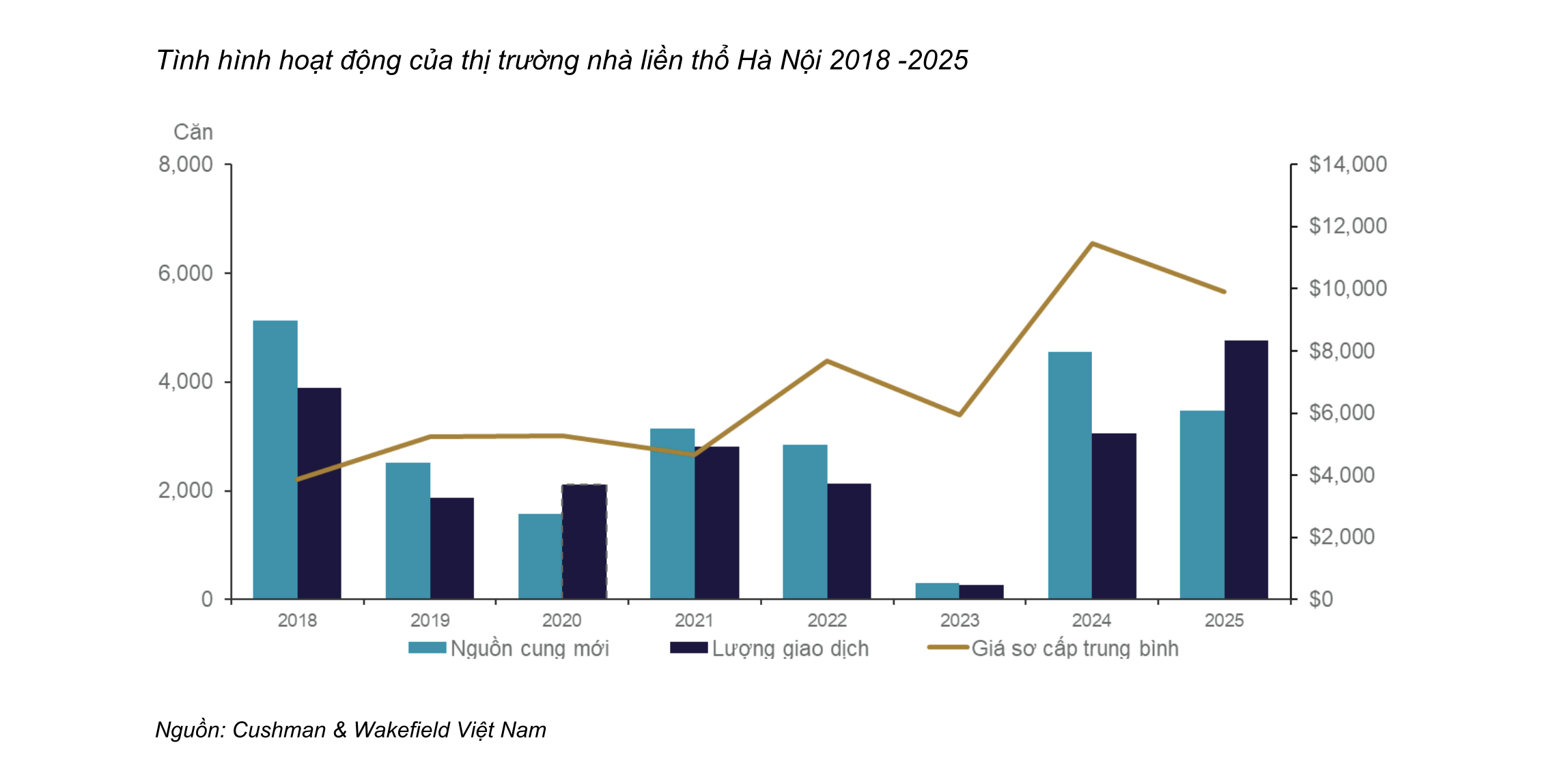 Phân khúc nhà liền thổ có diễn biến nguồn cung khác biệt, nhưng vẫn ghi nhận quỹ đạo tăng giá đáng chú ý. Theo Cushman & Wakefield Việt Nam, tổng nguồn cung tăng 1,4 lần, trong khi giá sơ cấp trung bình tăng 257%, tương đương CAGR 13%. Dù tốc độ tăng nguồn cung thấp hơn so với phân khúc căn hộ, phân khúc này vẫn duy trì mức tăng giá trị mạnh mẽ.