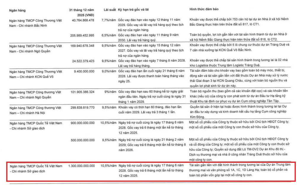Thông tin từ báo cáo tài chính hợp nhất kiểm toán năm 2025 cho thấy, Kinh Bắc đang sử dụng chính tài sản tương lai của dự án Láng Hạ, cùng toàn bộ cổ phần và phần vốn góp tại một số công ty con, để bảo đảm cho khoản vay 1.300 tỷ đồng tại Ngân hàng TMCP Quốc tế Việt Nam (VIB). Khoản vay có lãi suất 10,5%/năm, thời hạn đến ngày 17/6/2028; phần gốc được thanh toán định kỳ 6 tháng/lần, bắt đầu từ tháng 12/2025.
