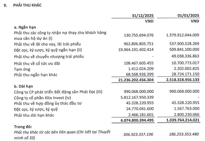 Khoản mục này được Sunshine thuyết minh là khoản phải thu dài hạn từ Công ty cổ phần Kita Invest liên quan đến hợp đồng hợp tác đầu tư số 01/2025/HĐHT/KITA-DIA ngày 7/10/2025 và phụ lục số 01 ngày 14/11/2025 mục đích nhận chuyển nhượng và đầu tư xây dựng kinh doanh phát triển dự án nhà ở cao tầng để bán kết hợp dịch vụ thương mại trên lô đất CT05 và CT06 thuộc Khu đô thị Nam Thăng Long (tên thương mại là Ciputra) tại Tây Hồ, Hà Nội. Như vậy, có hiểu đây là số tiền Sunshine đã trả trước cho Kita Invest liên quan đến việc mua lại hai khu đất.