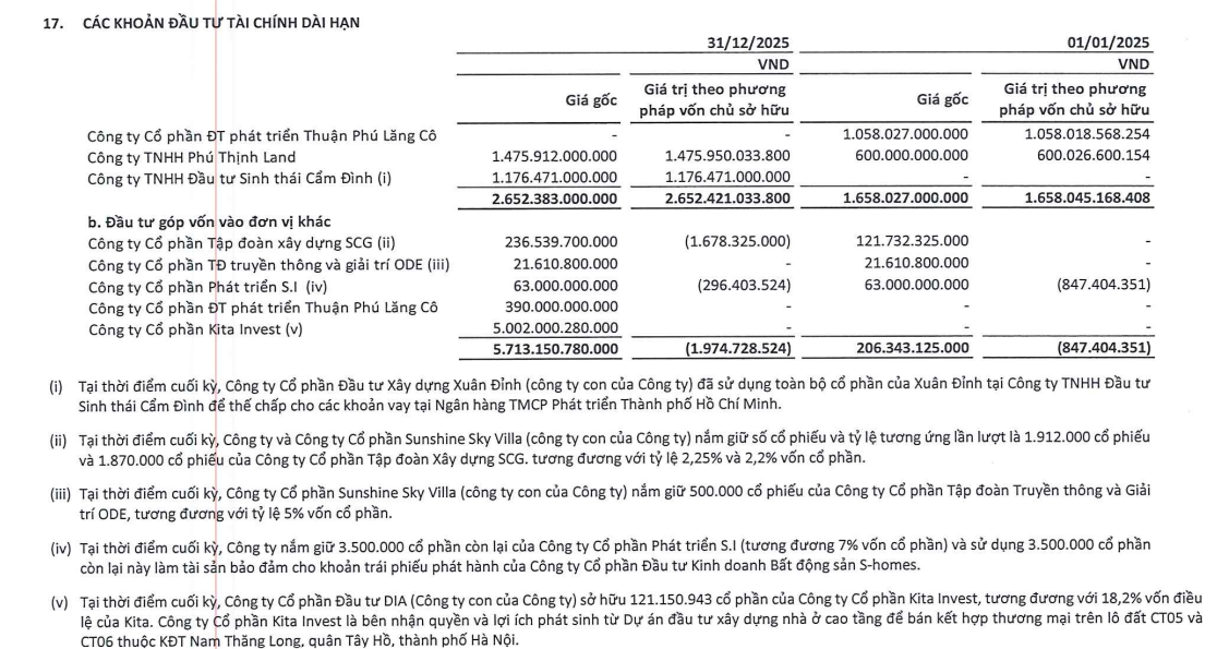 Bên cạnh giao dịch trên, tại thời điểm cuối năm 2025, Công ty cổ phần Đầu tư DIA (công ty con của Sunshine) cũng đang sở hữu hơn 121 triệu cổ phần của Kita Invest, tương đương với 18,2% vốn điều lệ của Kita. Khoản đầu tư này có giá gốc được ghi nhận là hơn 5.000 tỷ đồng.