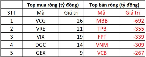 Ngược chiều, cổ phiếu VCG, VRE là các mã được mua ròng mạnh với giá trị lần lượt 26 tỷ và 21 tỷ đồng. Theo sau, cổ phiếu VIX và DGC được mua ròng khoảng 14-19 tỷ đồng mỗi mã, GEX cũng được mua ròng 9 tỷ đồng.