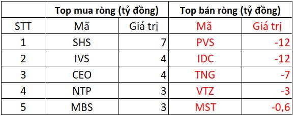 Tại chiều mua, cổ phiếu SHS, IVS và CEO được mua ròng mạnh nhất với giá trị 4-7 tỷ đồng, NTP và MBS cũng được mua khoảng 3 tỷ đồng mỗi mã.