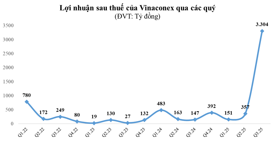 Trong kỳ, doanh thu thuần của Vinaconex đạt 4.429 tỷ đồng, tăng 65% so với cùng kỳ năm trước và lợi nhuận sau thuế quý III đạt 3.304 tỷ đồng, cao gấp hơn 21 lần cùng kỳ. Đây cũng là mức lợi nhuận quý cao nhất trong lịch sử hoạt động của doanh nghiệp xây dựng này.