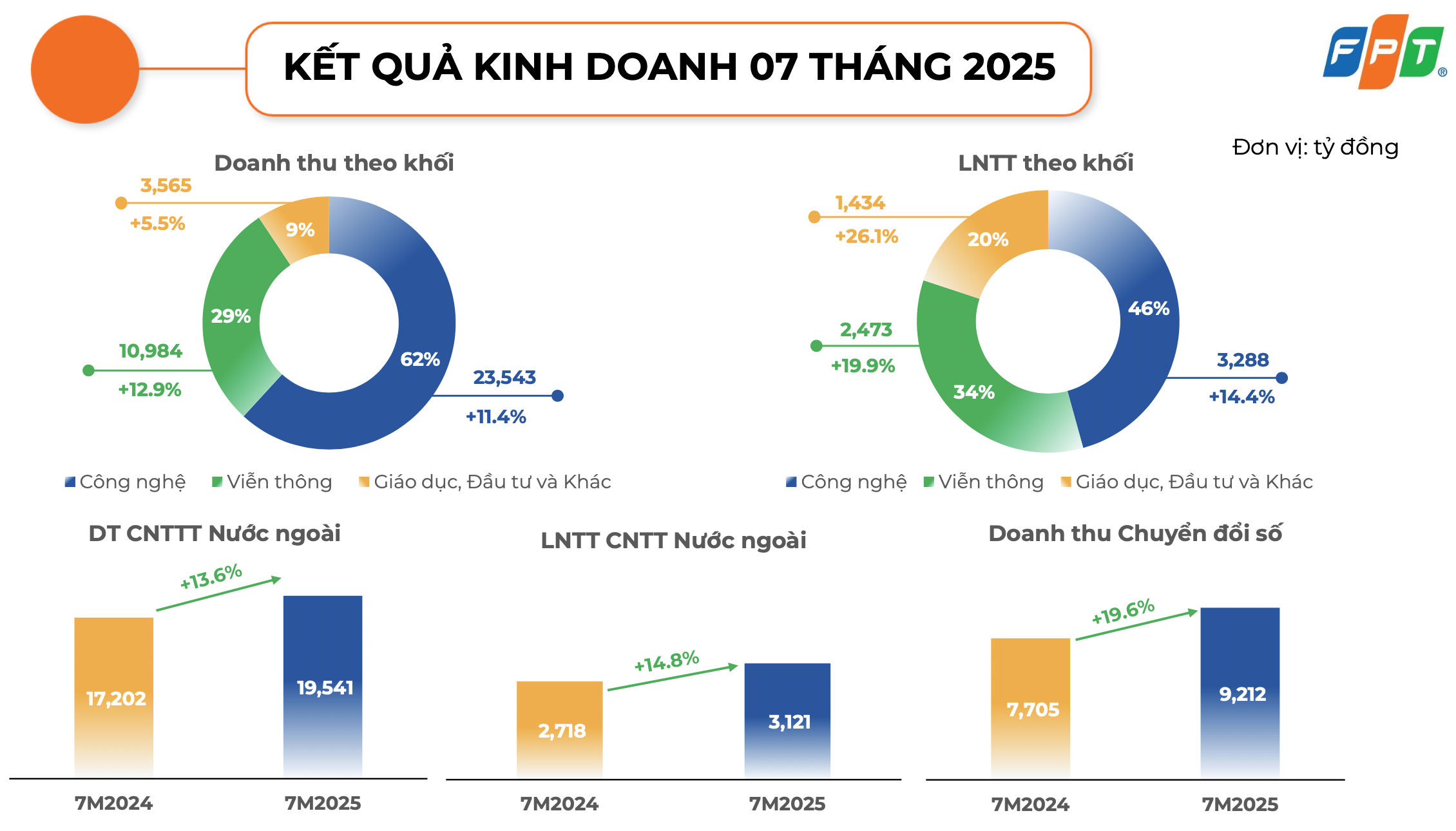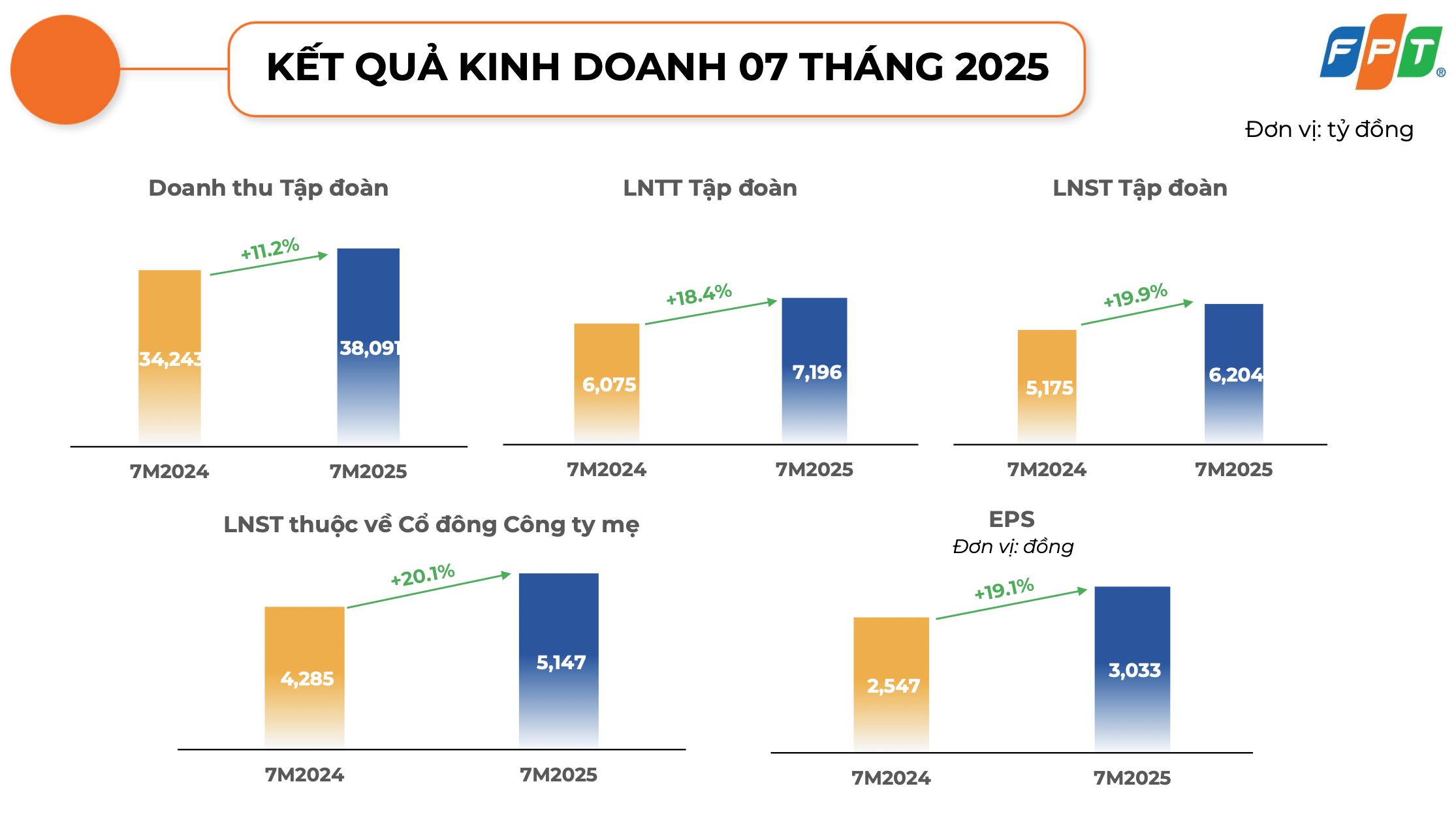 Tính riêng trong tháng 7, FPT đạt 5.408 tỷ đồng doanh thu, tăng 10,2% so với cùng kỳ 2024. Lợi nhuận sau thuế đạt 868 tỷ đồng, tăng 19,4% so với tháng 7/2024. Lãi ròng đạt 715 tỷ đồng, tăng 16,8% so với cùng kỳ năm ngoái.