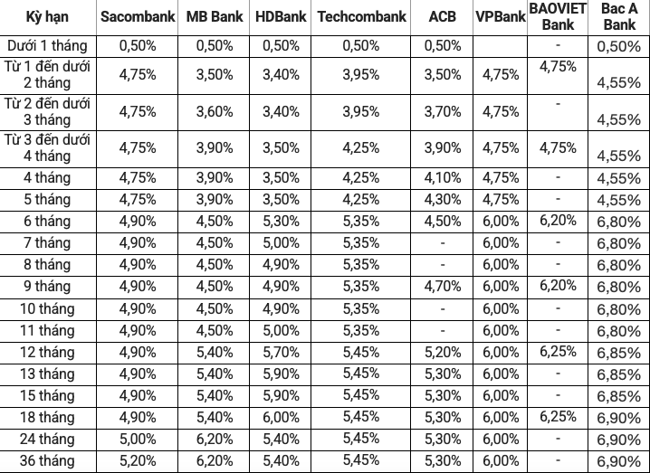 (*MB Bank, VPBank áp dụng với số tiền dưới 1 tỷ đồng, trên 1 tỷ đồng lãi suất được áp dụng cao hơn từ 0,1 – 0,2%/năm).