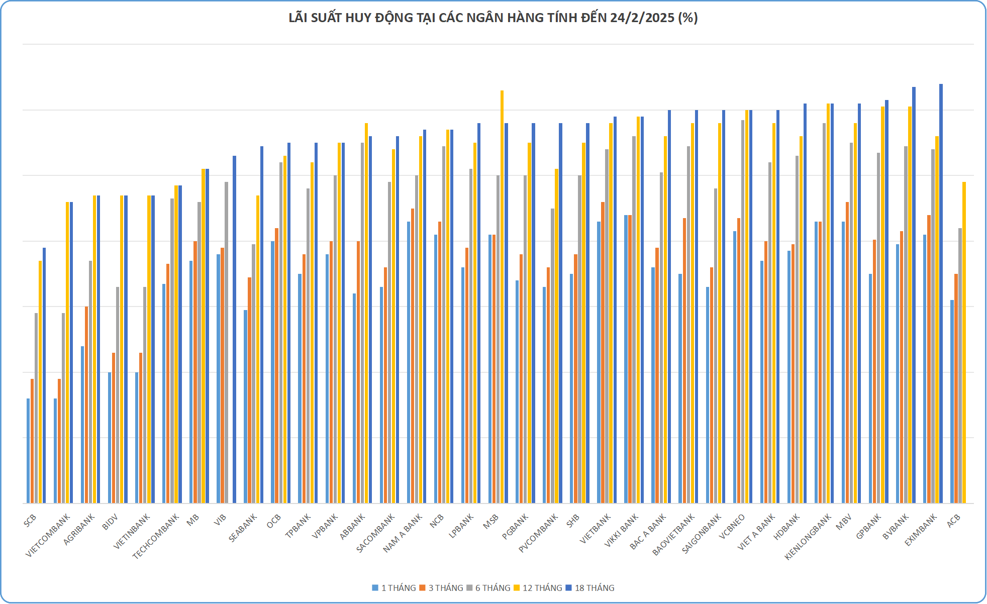 SaigonBank áp dụng mức lãi suất 6% cho kỳ hạn 12 và 18 tháng. HDBank áp dụng mức lãi suất 6% cho kỳ hạn 12 tháng và 6,1% cho kỳ hạn 18 tháng. BaoVietBank áp dụng mức lãi suất 6% cho kỳ hạn 12, 18. ABBank áp dụng mức lãi suất 6% đối với kỳ hạn 12 tháng. VCBNeo áp dụng mức lãi suất 6% cho các kỳ hạn từ 12 tháng trở lên.