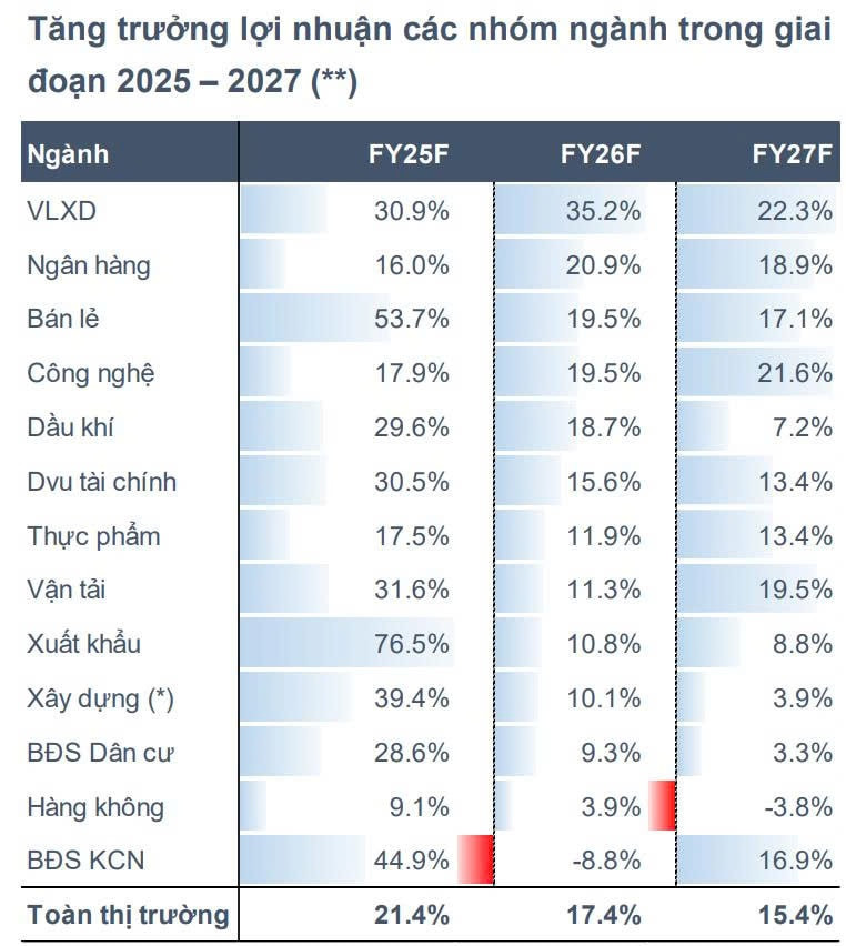 Cũng theo báo cáo, sau khi loại trừ lợi nhuận bất thường, lợi nhuận toàn thị trường được ước tính tăng 20% - 21% năm 2025 và khoảng 15% - 17% trong giai đoạn 2026 - 2027. Nhóm vật liệu xây dựng nổi bật nhờ dự án Dung Quất 2 của HPG, cùng sự phục hồi của HSG và NKG khi tái cơ cấu thị trường. Ngân hàng duy trì tăng trưởng hai chữ số nhờ tín dụng cải thiện; bán lẻ được hỗ trợ bởi tiêu dùng thiết yếu; dầu khí chậm lại nhưng ổn định nhờ giá dầu ít biến động. Trong bối cảnh lãi suất tăng, doanh nghiệp có “tiền mặt ròng” được đánh giá có sức đề kháng tốt hơn.