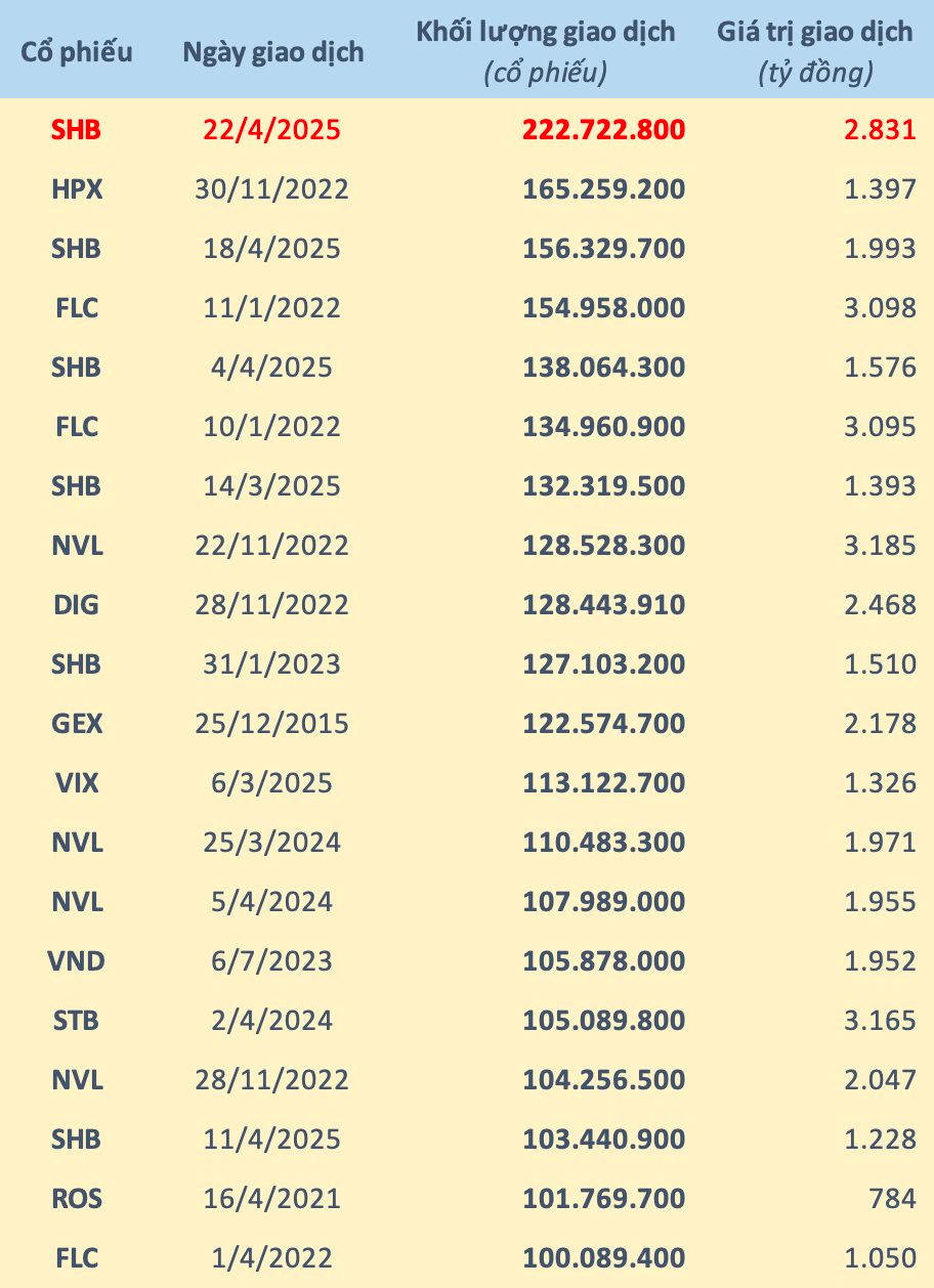 Cổ phiếu SHB là một trong những tâm điểm chú ý khi ngược dòng từ mức giá sàn về tham chiếu với thanh khoản cao kỷ lục. Khối lượng giao dịch đạt hơn 222 triệu đơn vị, tương ứng giá trị hơn 2.800 tỷ đồng, lớn nhất sàn chứng khoán phiên 22/4. Đây là lần đầu tiên trong lịch sử chứng khoán Việt Nam có một cổ phiếu giao dịch hơn 200 triệu đơn vị một phiên.