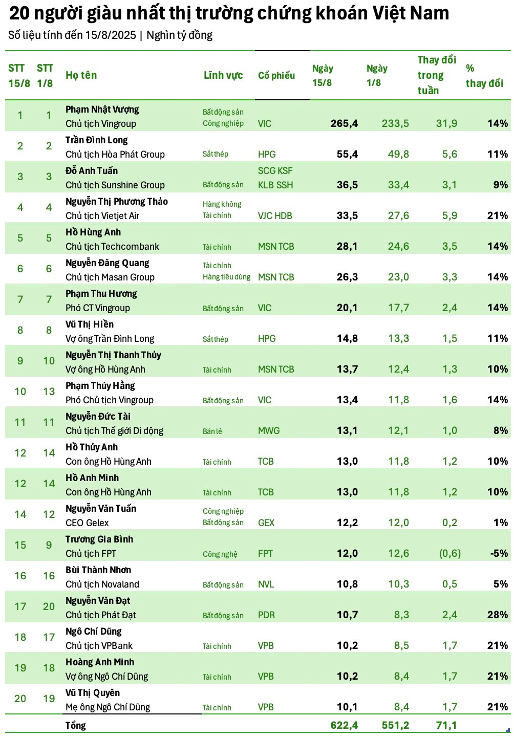 Tính đến ngày 15/8/2025, khối tài sản của 20 người giàu nhất sàn chứng khoán Việt Nam tăng thêm 71.100 tỷ đồng chỉ trong 1 tuần, lên mức 622.400 tỷ đồng.